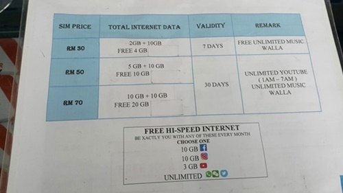 다낭 유심 , 태국 유심, 코타키나발루 유심  Price